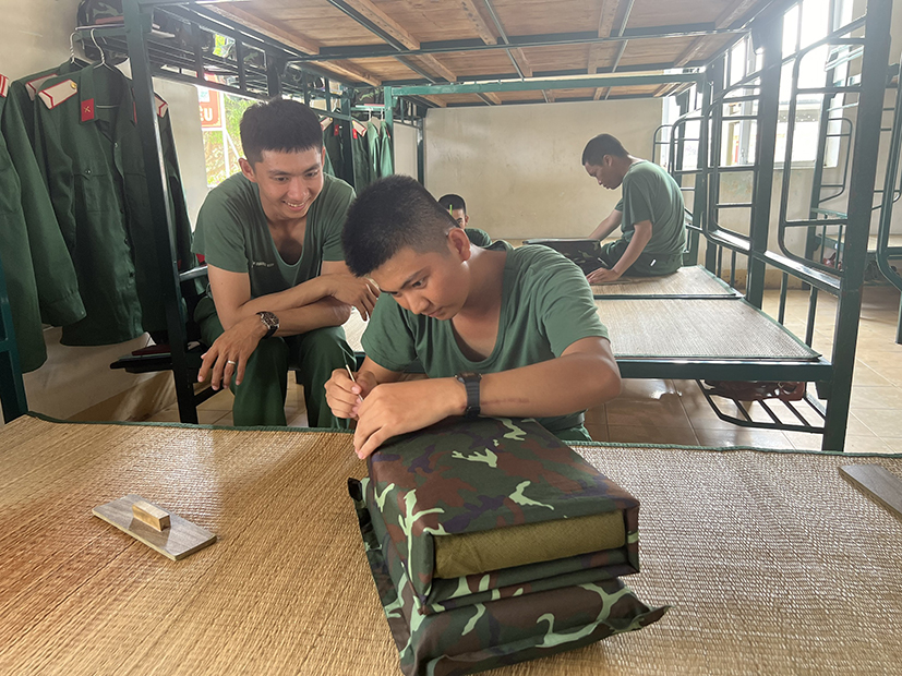 | Đối với các chiến sĩ có kinh nghiệm, công việc này chỉ tốn ít phút, nhưng với chiến sĩ mới, họ phải mất nhiều thời gian hơn và cần sự hướng dẫn tỉ mỉ của cán bộ. Trong ảnh: Cán bộ Tiểu đoàn 440, Trung đoàn Minh Đạm hướng dẫn chiến sĩ mới cách gấp chăn theo đúng quy định. |