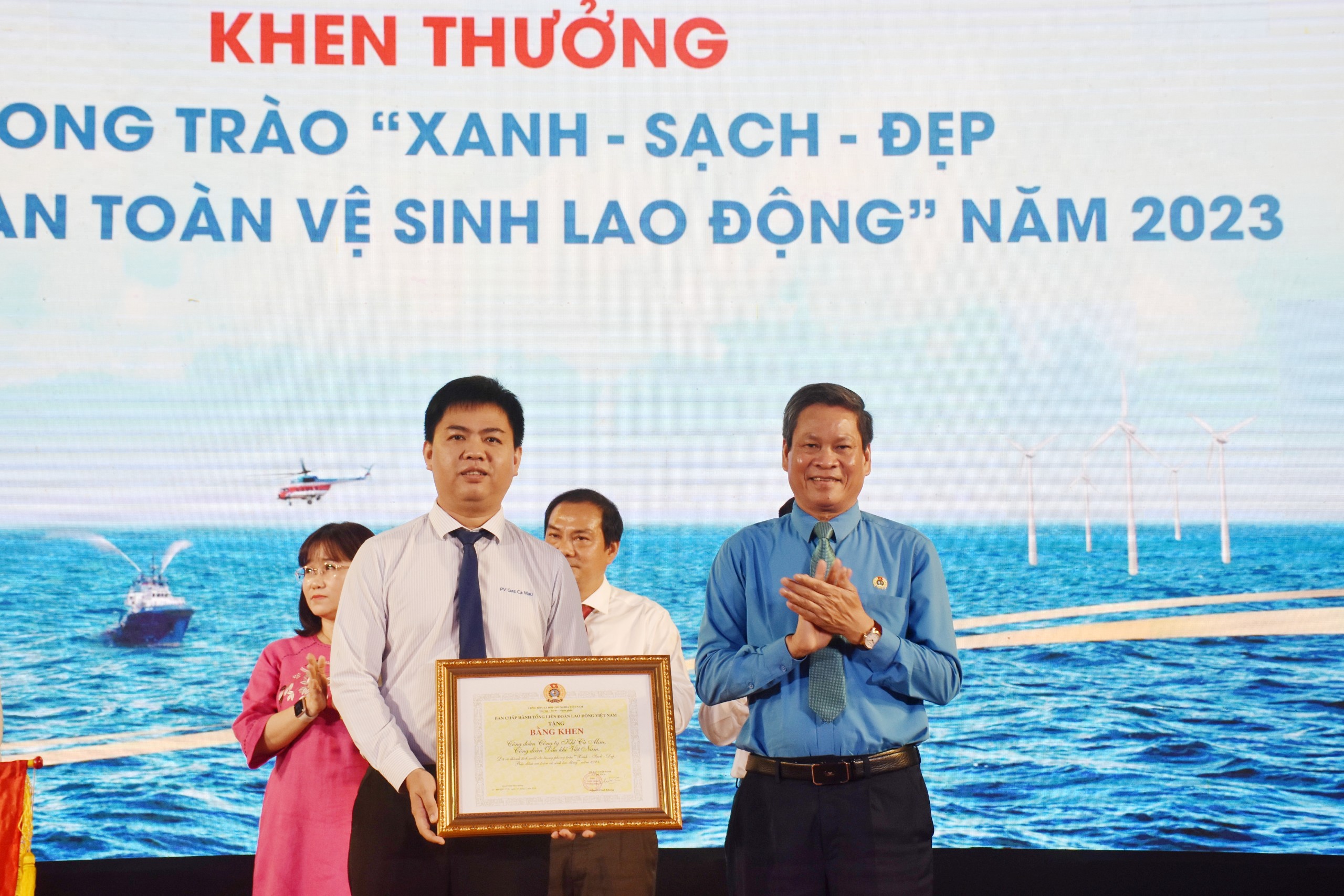 | Ông Lê Ngọc Sơn, Tổng Giám đốc Tập đoàn dầu khí Việt Nam và ông Huỳnh Thanh Xuân, Phó Chủ tịch Tổng LĐLĐ Việt Nam khen thưởng cho NLĐ tiêu biểu. |