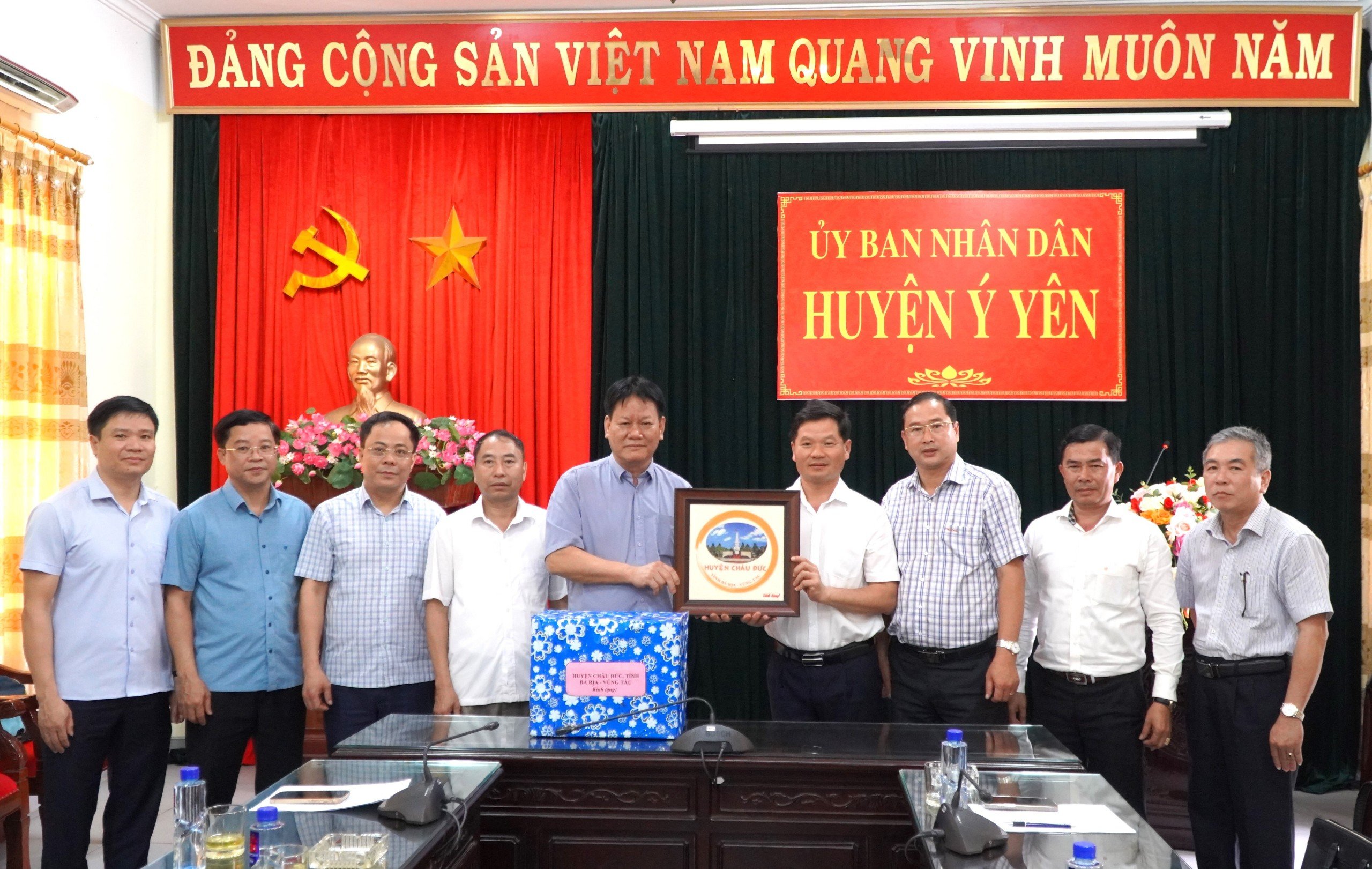 | Đoàn công tác huyện Châu Đức làm việc và tặng quà lưu niệm tại huyện Ý Yên (tỉnh Nam Định). |