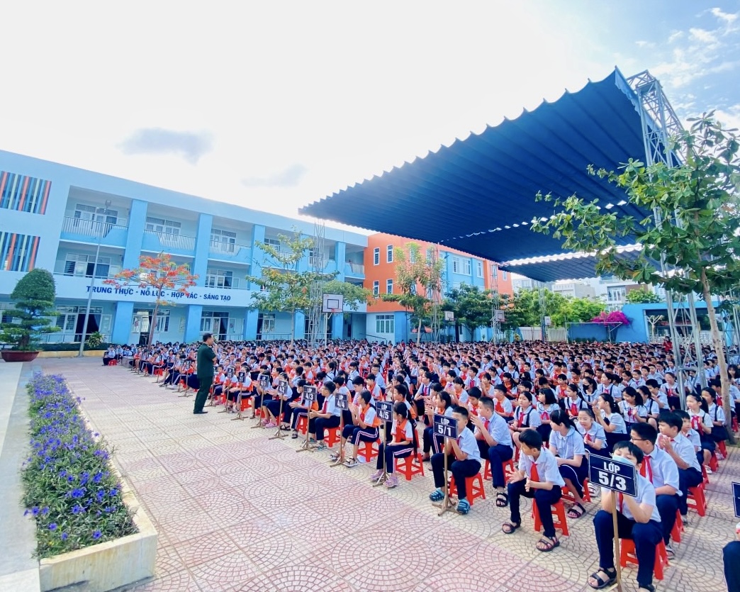 | Gần 1.200 HS Trường TH Nguyễn Hữu Cảnh nghe kể về lịch sử dân tộc. |