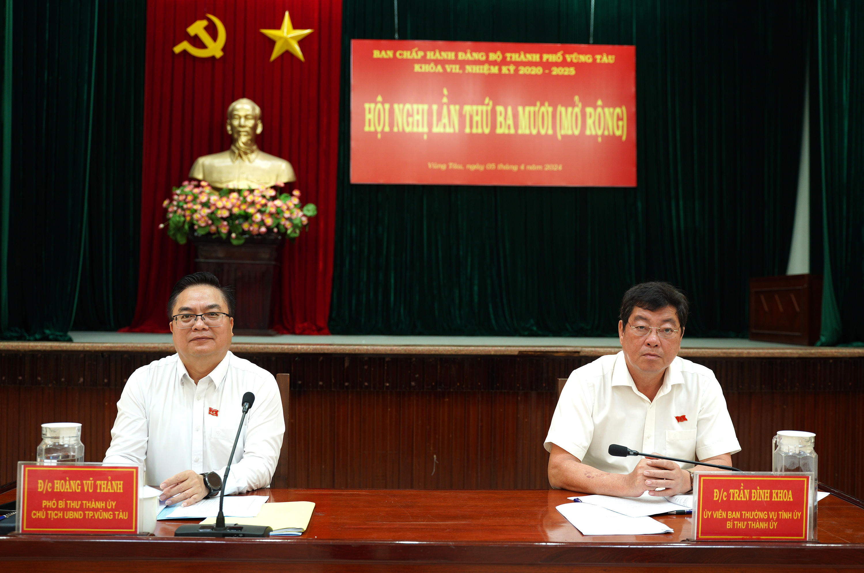 | Ông Trần Đình Khoa, Ủy viên Ban Thường vụ Tỉnh ủy, Bí thư Thành ủy; ông Hoàng Vũ Thảnh, Phó Bí thư Thành ủy, Chủ tịch UBND TP.Vũng Tàu chủ trì hội nghị. |