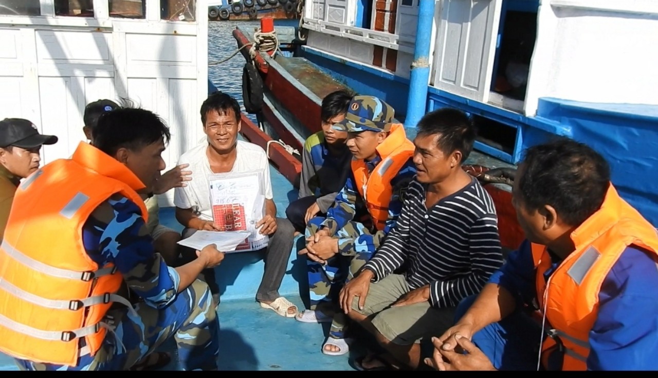 | Cán bộ Trung tâm Trung tâm Dịch vụ Hậu cần - Kỹ thuật đảo Trường Sa tuyên truyền pháp luật về khai thác hải sản cho tàu cá. |