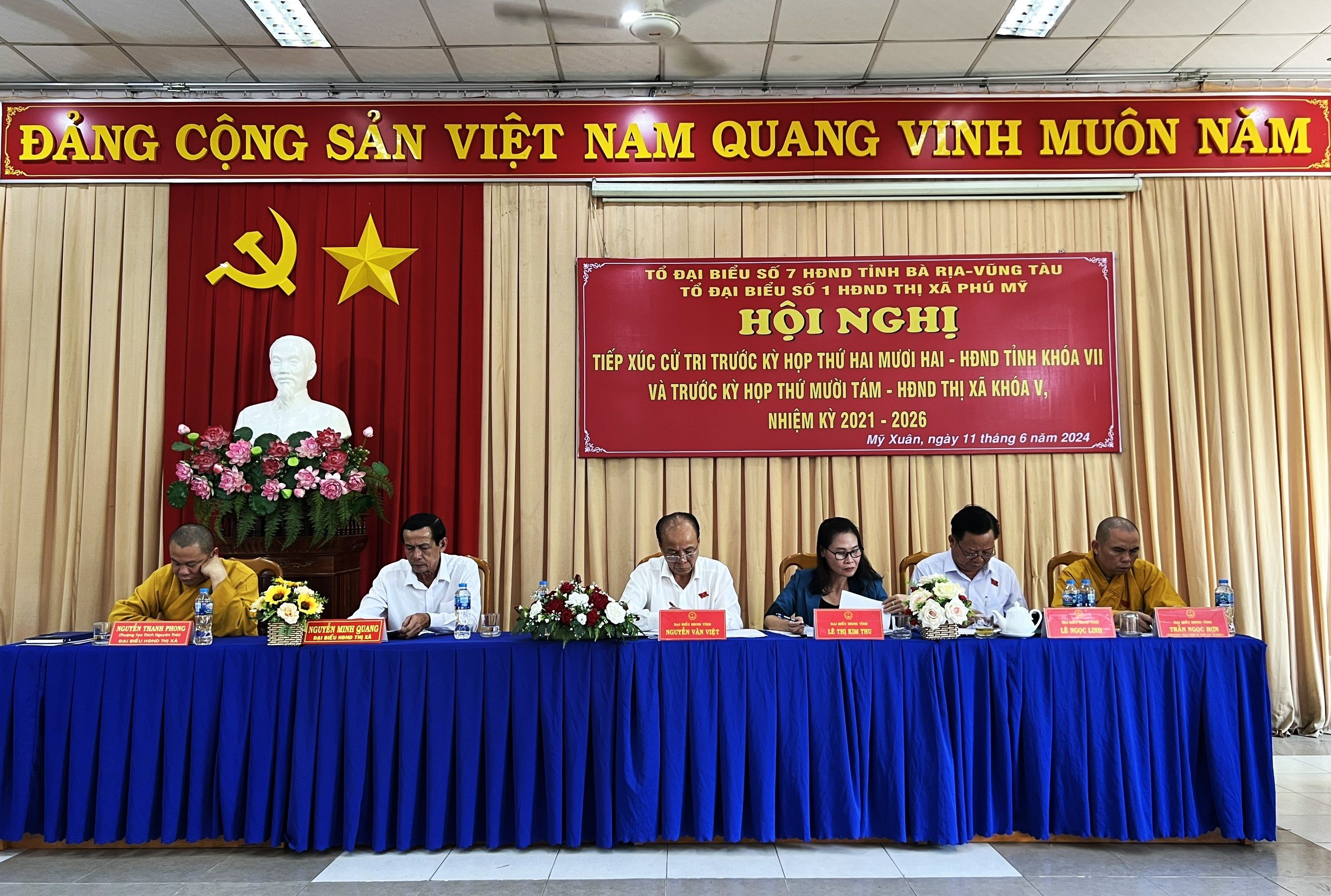 Tổ đại biểu số 7 HĐND tỉnh (ảnh dưới) gồm: ông Nguyễn Văn Việt, Bí thư Thị ủy Phú Mỹ; Thượng tọa Thích Nhuận Nghĩa, Phó Trưởng ban Thường trực Ban Trị sự Giáo hội Phật giáo Việt Nam tỉnh... đã TXCT phường Mỹ Xuân (TX.Phú Mỹ).