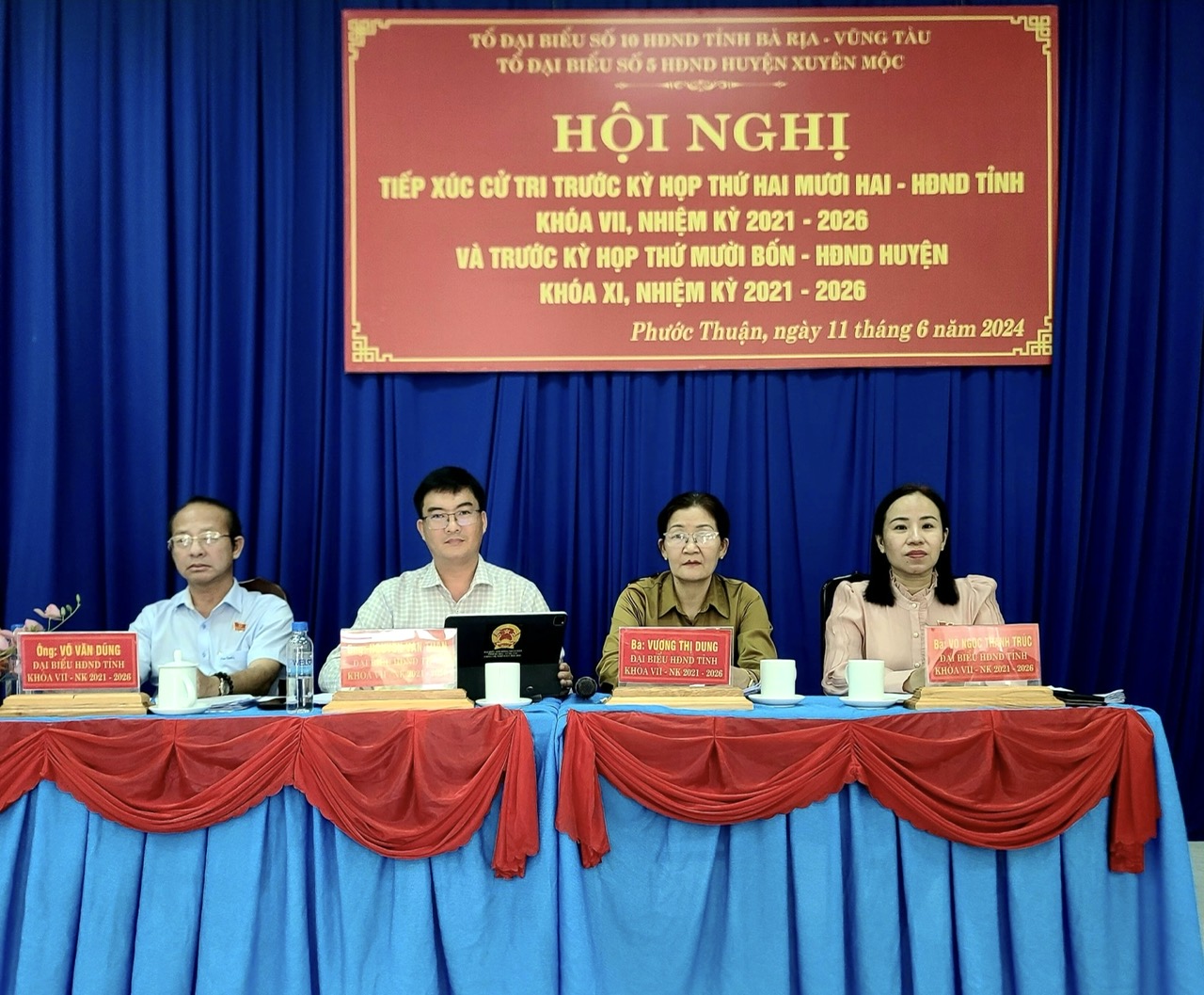 Tổ đại biểu số 10 HĐND tỉnh (ảnh dưới) gồm: ông Võ Văn Dũng, Chủ nhiệm Ủy ban Kiểm tra Tỉnh ủy; bà Võ Ngọc Thanh Trúc, Phó Trưởng Ban Tổ chức Tỉnh ủy; bà Vương Thị Dung, Phó Chủ tịch Hội LHPN tỉnh; ông Nguyễn Văn Tuân, Phó Trưởng Ban Văn hoá - Xã hội HĐND tỉnh đã TXCT xã Phước Thuận (huyện Xuyên Mộc).