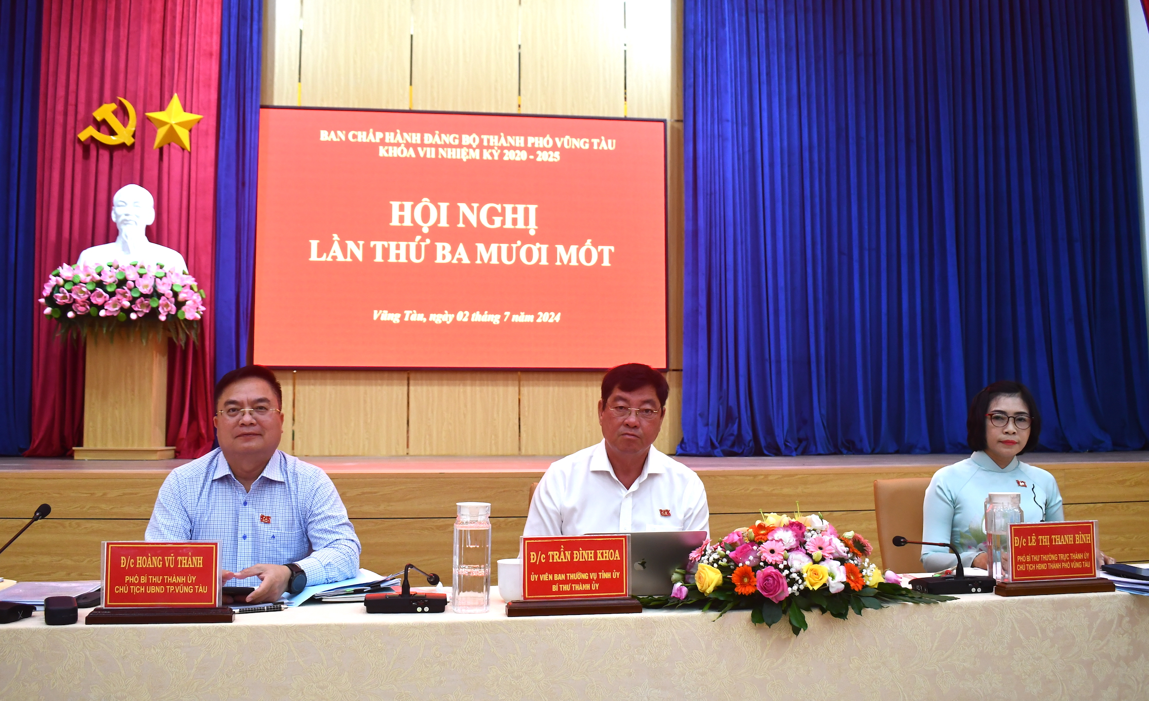 | Ông Trần Đình Khoa, Bí thư Thành ủy Vũng Tàu; bà Lê Thị Thanh Bình, Phó Bí thư Thường trực, Chủ tịch HĐND TP. Vũng Tàu; ông Hoàng Vũ Thảnh, Phó Bí thư, Chủ tịch UBND TP.Vũng Tàu chủ trì hội nghị. |