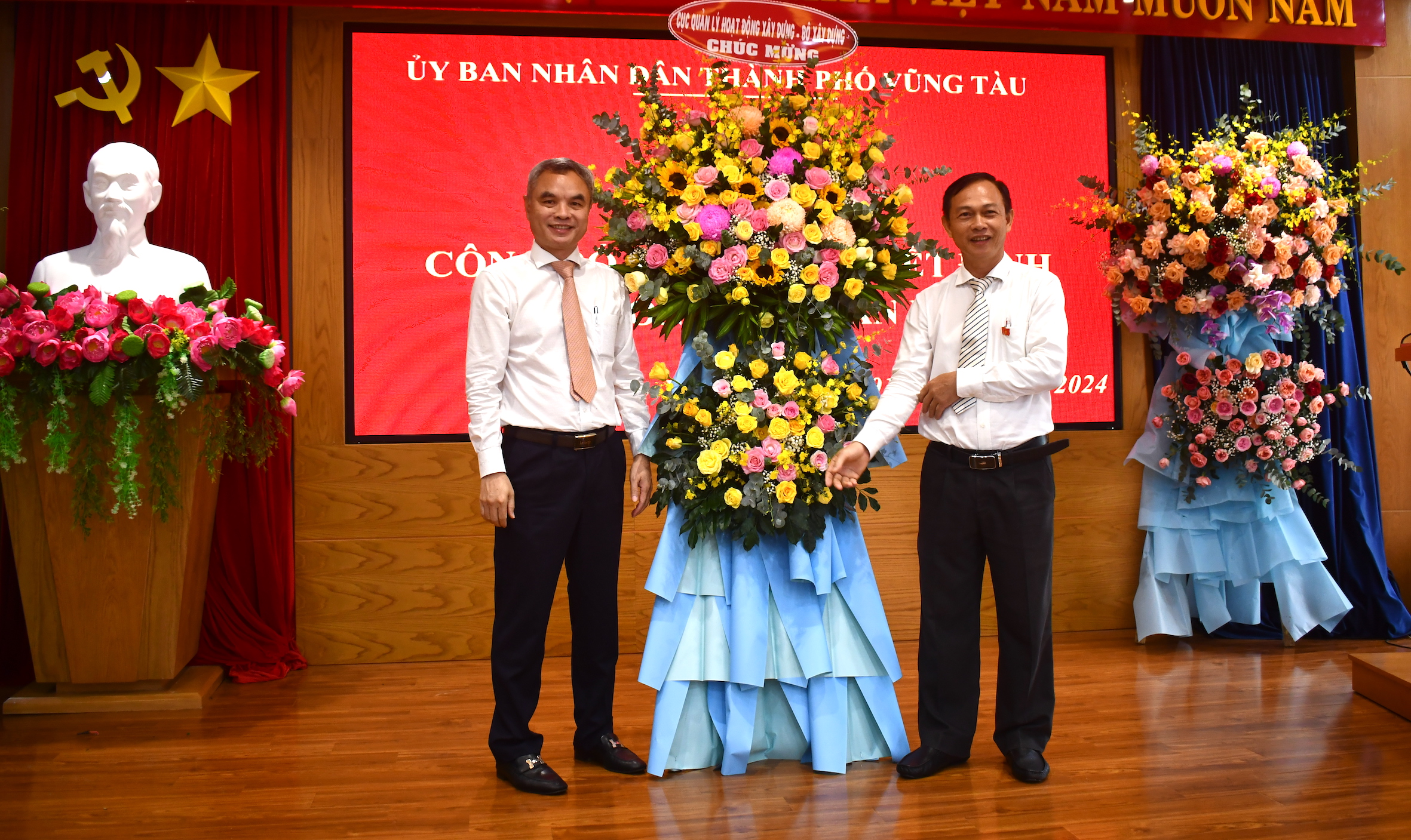 | Ông Mai Trung Hưng, Phó Giám đốc Sở Xây dựng tặng hoa của ngành chúc mừng tân Trưởng phòng Quản lý đô thị TP.Vũng Tàu Nguyễn Văn Huynh. |