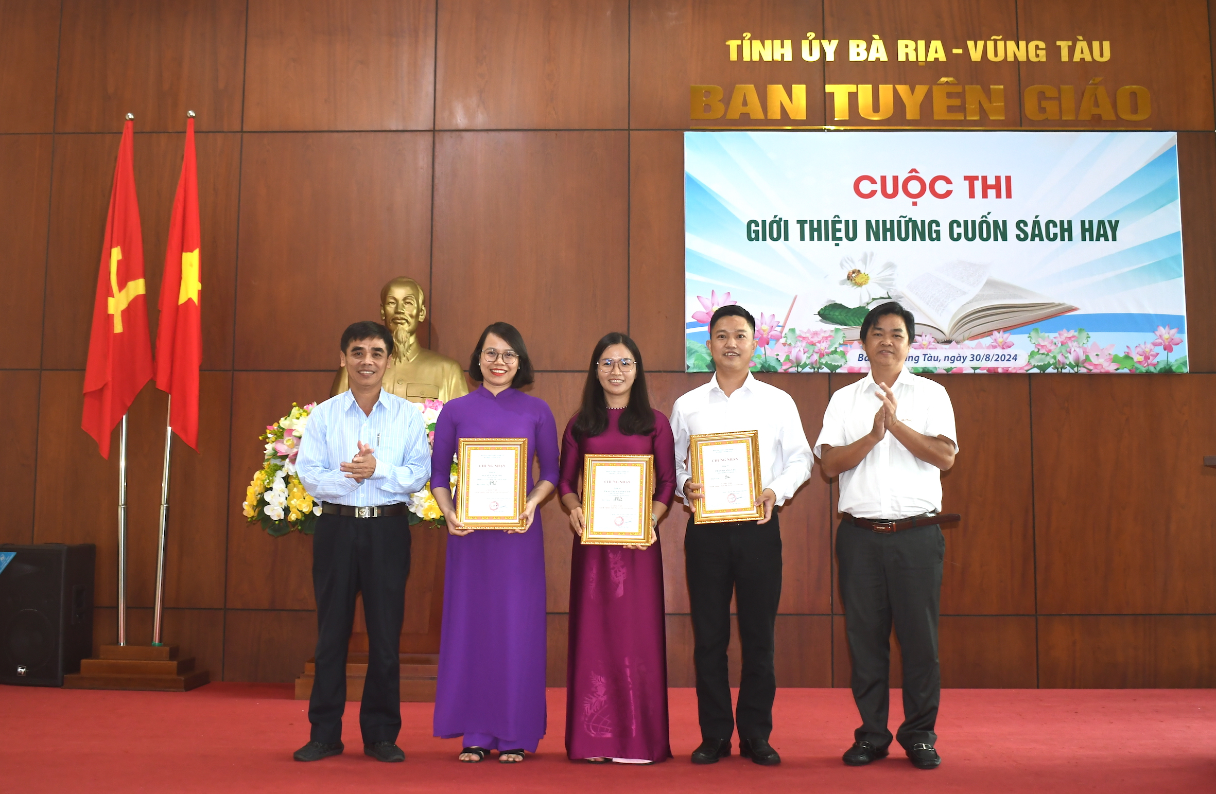 | Ông Lê Văn Minh, Phó Trưởng Ban Tuyên giáo Tỉnh ủy và ông Huỳnh Tới, Phó Giám đốc Thư viện tỉnh trao giải Nhất, giải Nhì và giải Ba cuộc thi. |