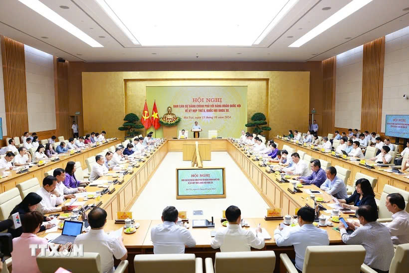 Hội nghị Ban Cán sự Đảng Chính phủ với Đảng đoàn Quốc hội về Kỳ họp thứ 8, Quốc hội khóa XV diễn ra sáng 15/10, tại trụ sở Chính phủ.