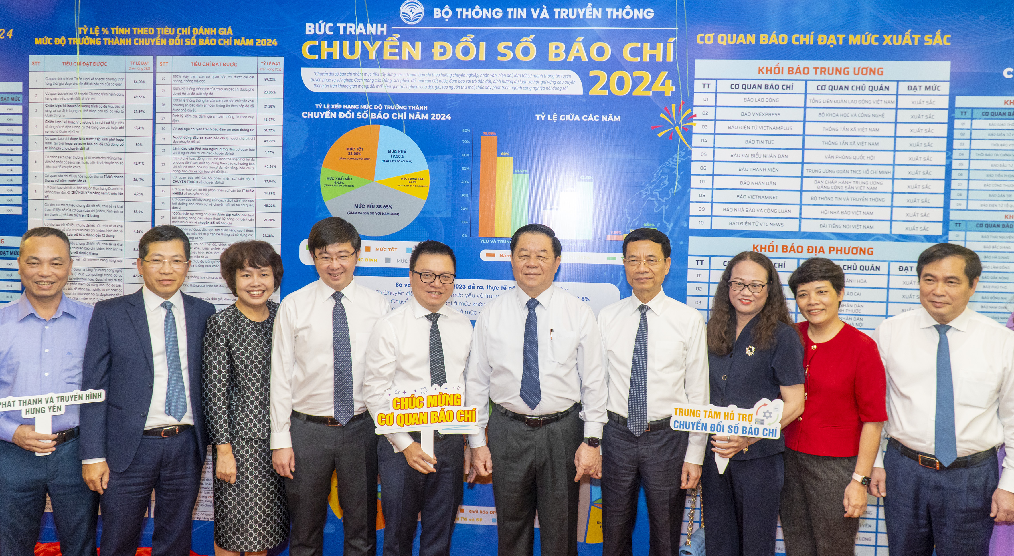 | Các đại biểu thực hiện nghi thức công bố Bức tranh chuyển đổi số báo chí năm 2024; kết quả đánh giá, đo lường mức độ trưởng thành chuyển đổi số báo chí năm 2024. |