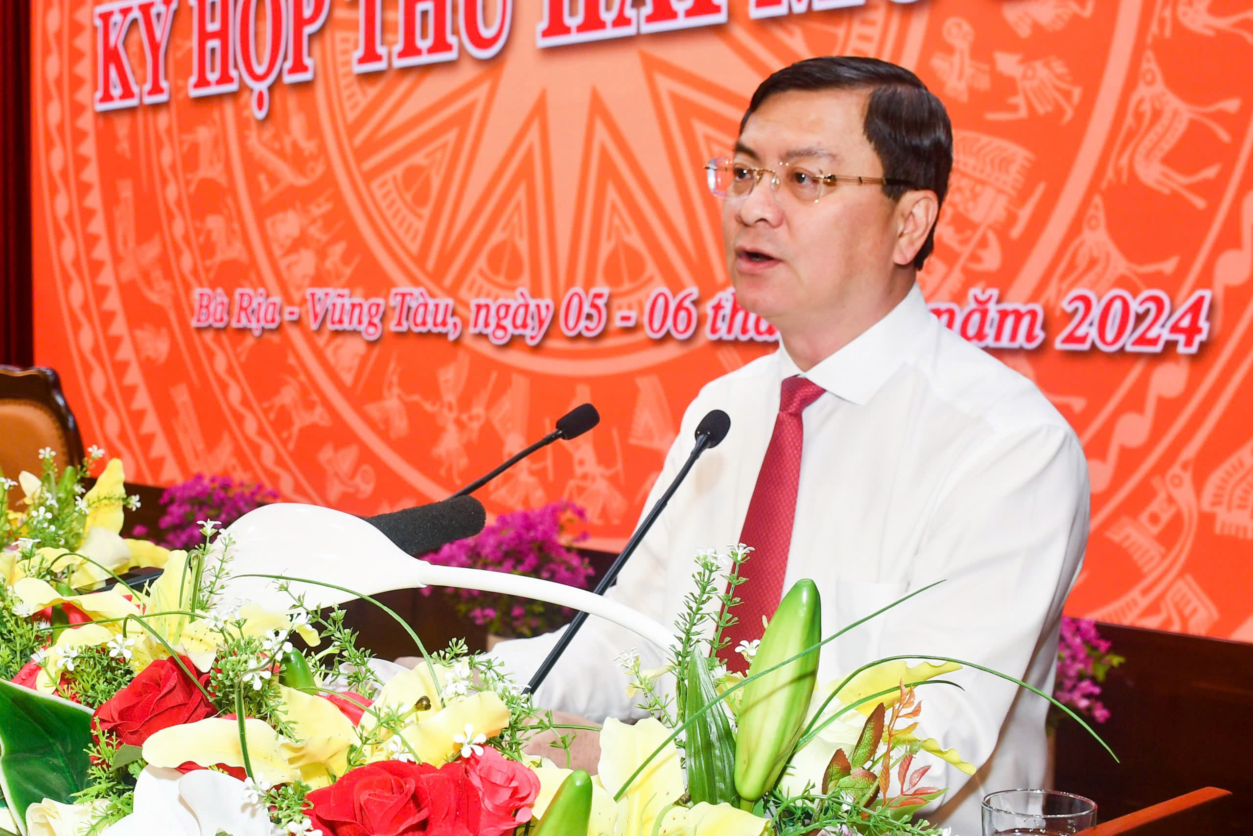 | Ông Nguyễn Công Vinh, Phó Chủ tịch UBND tỉnh trình bày Báo cáo tình hình thực hiện nhiệm vụ phát triển kinh tế - xã hội, quốc phòng - an ninh năm 2024 và một số nhiệm vụ trọng tâm năm 2025 của tỉnh Bà Rịa - Vũng Tàu. |
