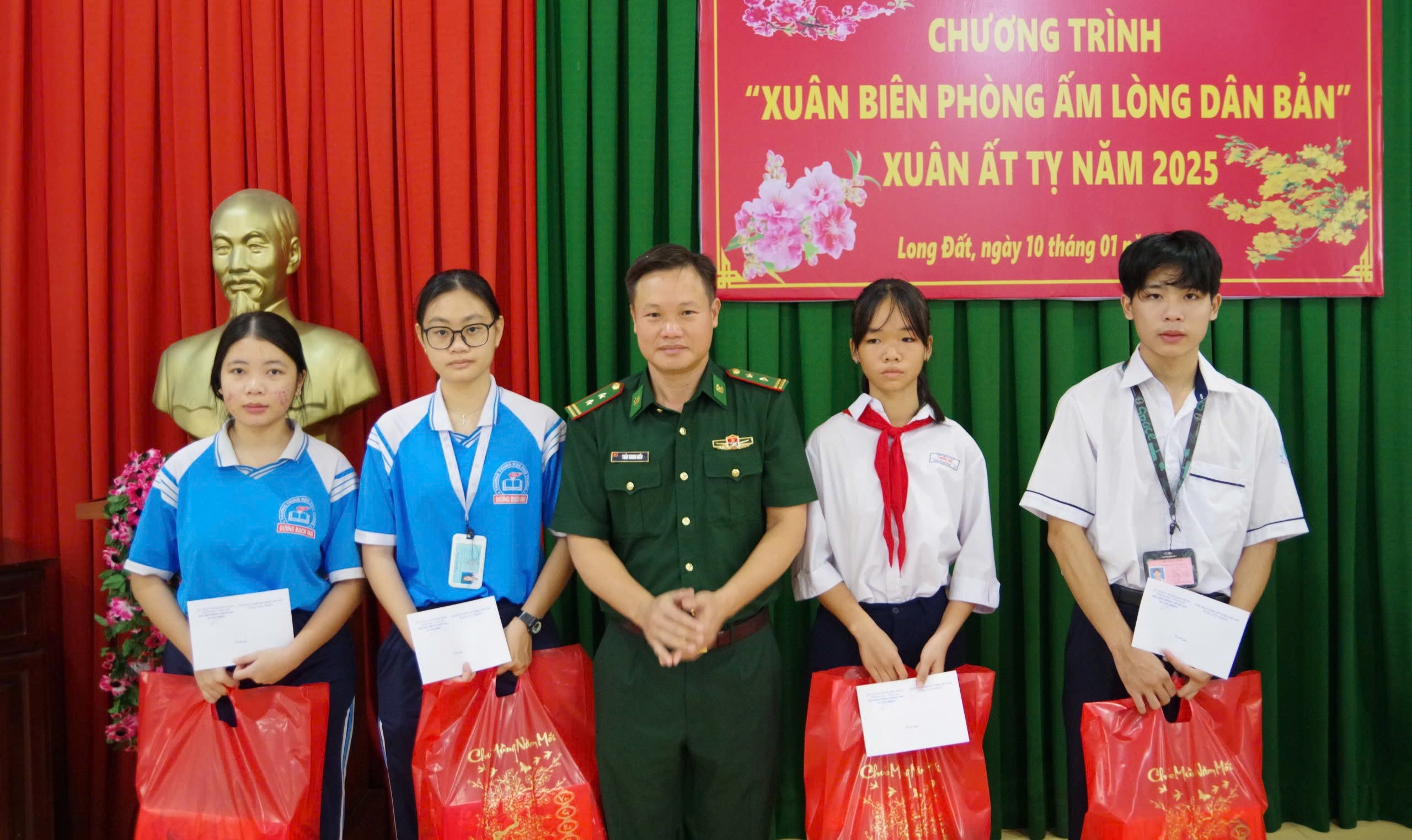 | Đại diện Đồn Biên phòng Phước Hải tặng quà Tết cho các em học sinh trong chương trình “Nâng bước em tới trường”. |