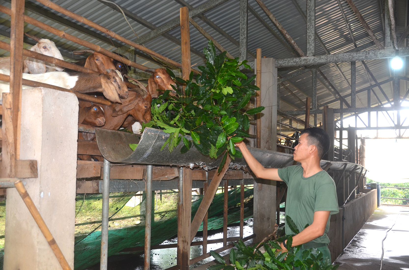 | Chiến sĩ Trung đoàn Minh Đạm chăm sóc đàn dê, chuẩn nguồn thực phẩm trong dịp Tết Nguyên đán. |