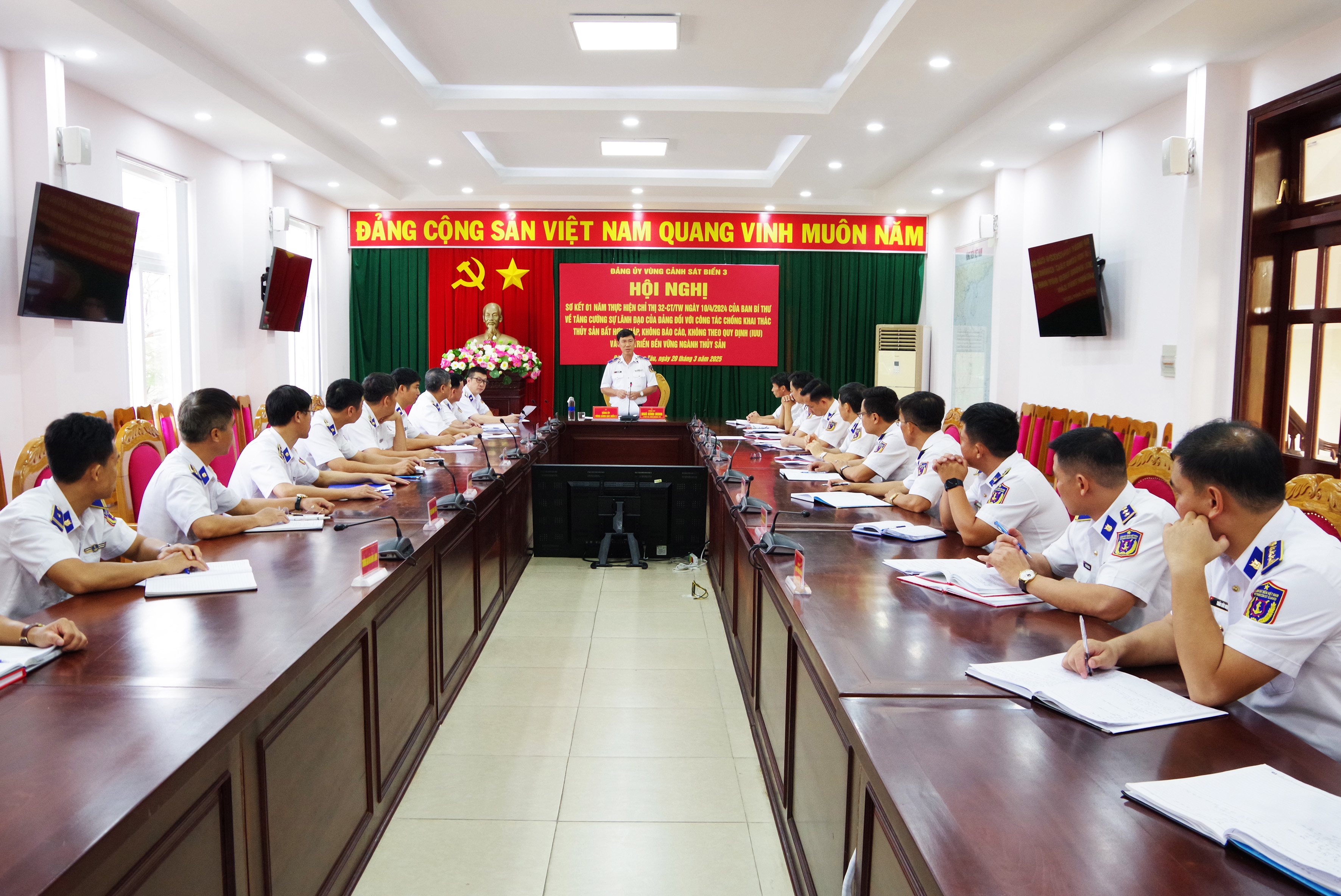 Ngày 20/3, Đảng ủy Vùng Cảnh sát biển 3 tổ chức sơ kết 1 năm thực hiện Chỉ thị số 32-CT/TW, ngày 10/4/2024 của Ban Bí thư (Chỉ thị 32) về tăng cường sự lãnh đạo của Đảng đối với công tác chống khai thác thủy sản bất hợp pháp, không báo cáo, không theo quy định (IUU) và phát triển bền vững ngành thủy sản.