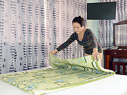 | Nhân viên Nhà nghỉ Biên Phòng làm phòng, chuẩn bị đón khách. |