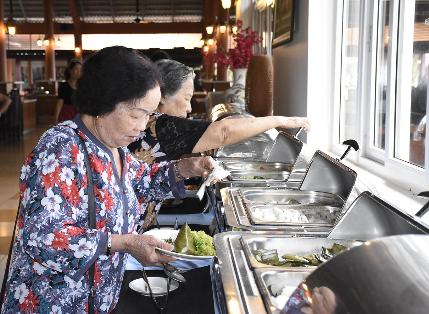 | Nhóm khách cao tuổi đến từ TP.Hồ Chí Minh ăn sáng tại Hương Phong-Hồ Cốc Beach Resort. |