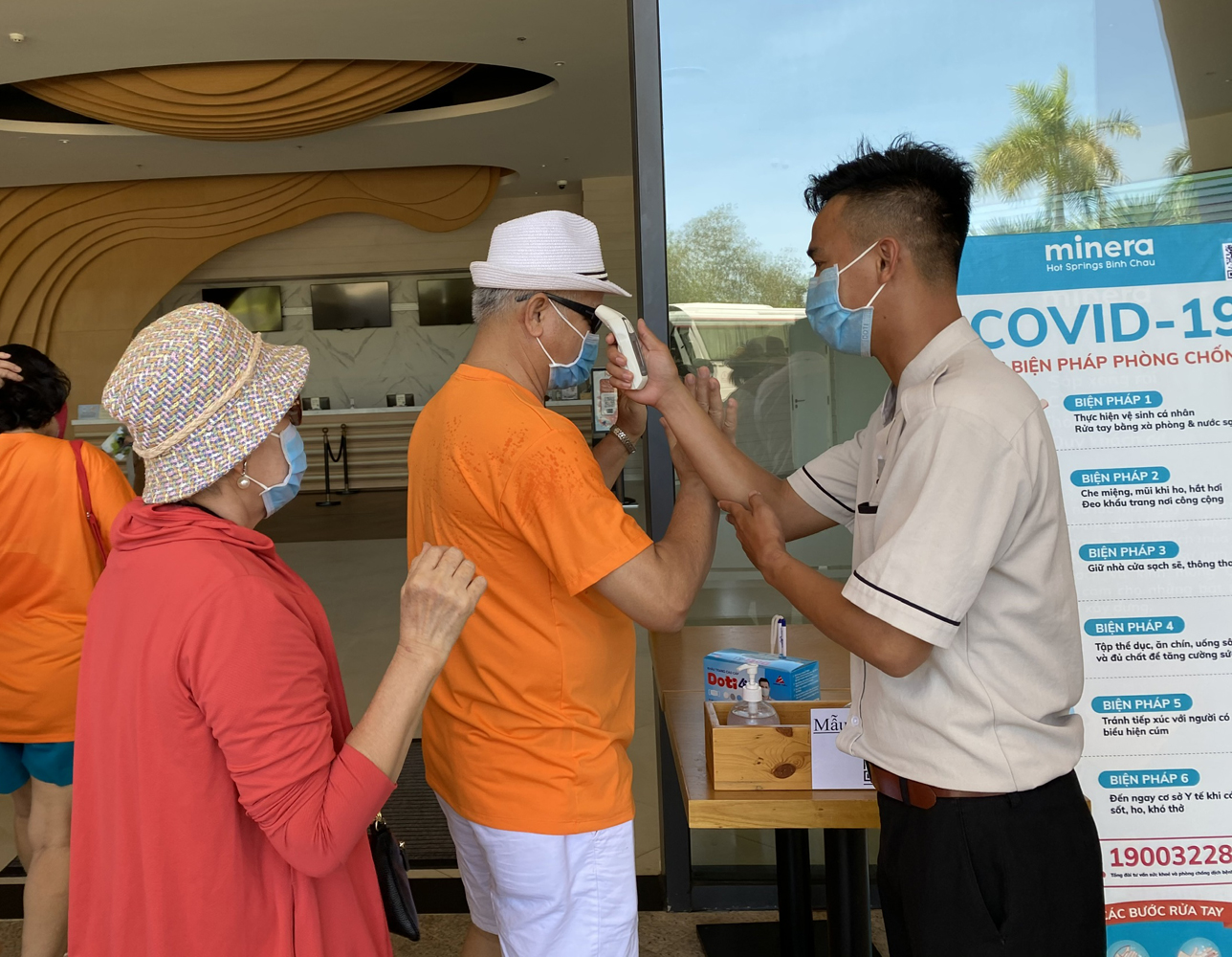 | BR-VT vẫn đón khách du lịch nhưng kiểm soát, sàng lọc kỹ nguồn khách đầu vào. Trong ảnh: Nhân viên Minera Binh Chau đo kiểm tra thân nhiệt du khách. |