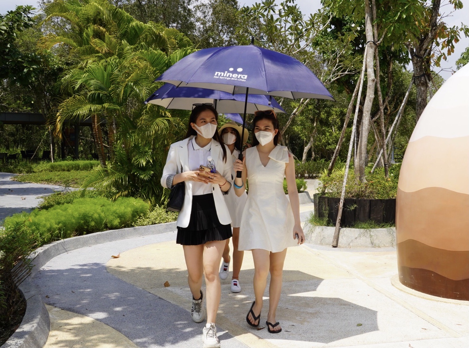 | Những vị khách đầu tiên đến Bình Châu Hot Springs trong ngày đầu mở cửa tái khởi động du lịch sau hơn 4 tháng đóng băng vì dịch COVID-19. Trong ảnh: Khách tham quan khuôn viên Bình Châu Hot Springs. |