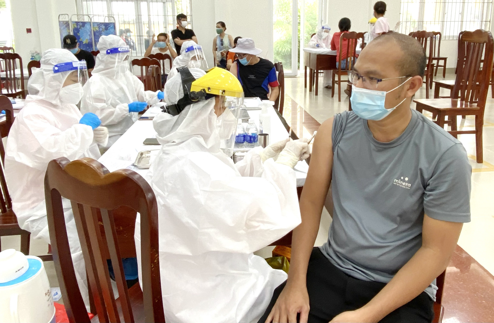 | BR-VT đang đẩy mạnh tiêm vắc xin ngừa COVID-19 cho công nhân lao động. Trong ảnh: Nhân viên Bình Châu Hot Springs tiêm vắc xin mũi 2 tại Trung tâm Y tế huyện Xuyên Mộc. |
