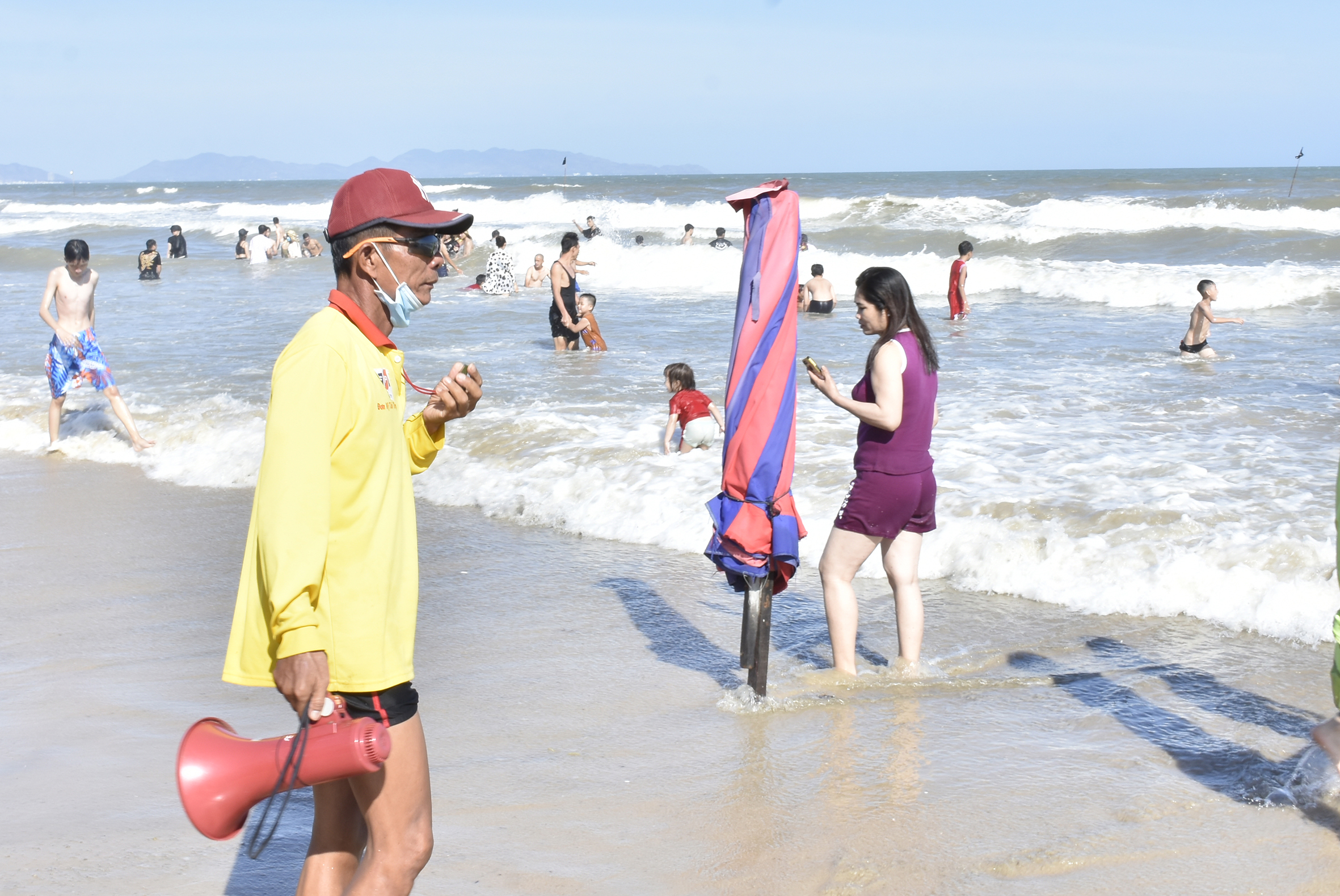 | Từ 9 giờ đến 16 giờ ngày mùng 2 Tết, nước biển dâng lên cao, kèm sóng lớn. Do vậy, nhân viên cứu hộ phải xuống mép nước làm nhiệm vụ cảnh báo, giữ an toàn cho khách tắm biển. Trong ảnh: Anh Ngô Thế Miễn, nhân viên cứu hộ thuộc Trung tâm Quản lý và Hỗ trợ khách du lịch TP.Vũng Tàu quan sát người dân tắm biển. |