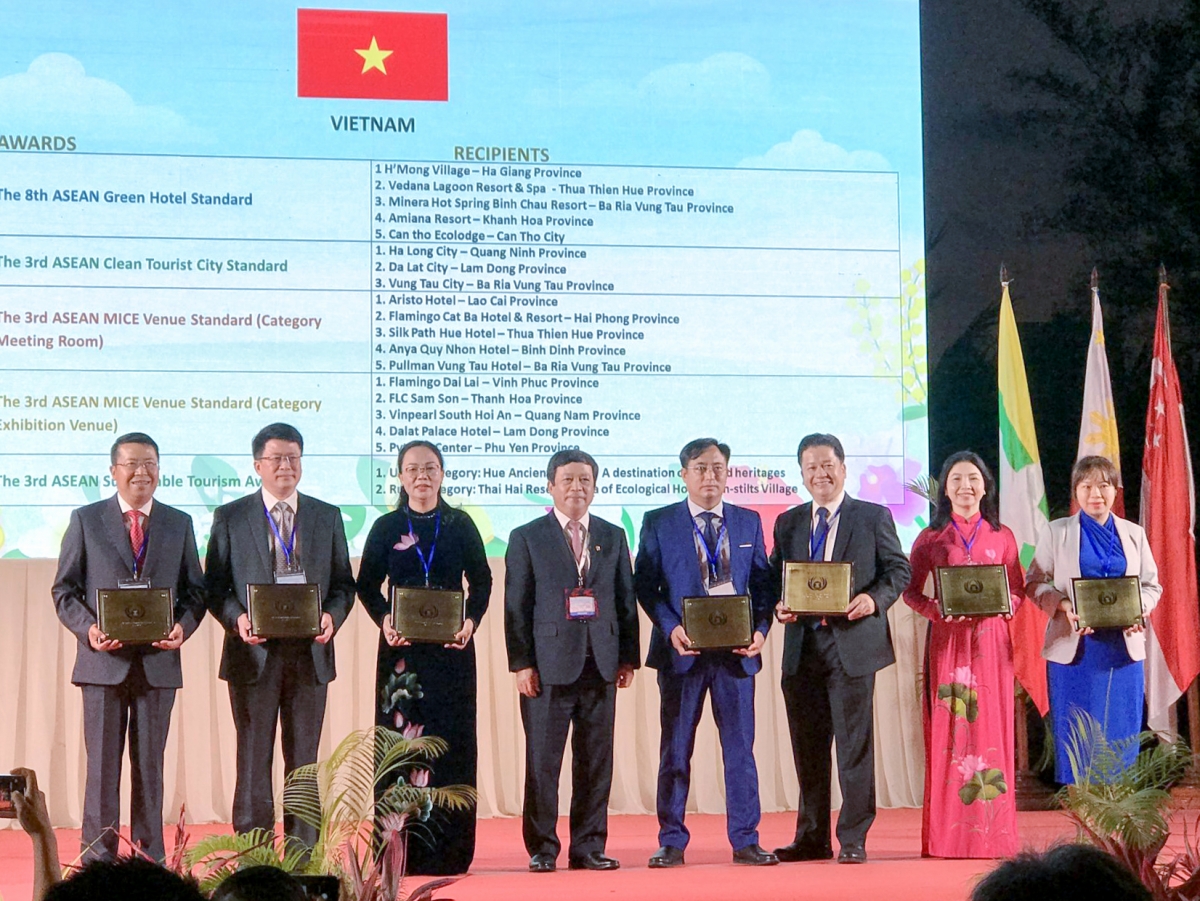 | Bà Nguyễn Thị Thu Hương (thứ 3 từ trái qua), Phó Chủ tịch UBND TP. Vũng Tàu nhận giải thưởng Thành phố du lịch sạch ASEAN 2021 trong khuôn khổ ATF 2022 diễn ra tại Campuchia vào tối 19/1/2022. |