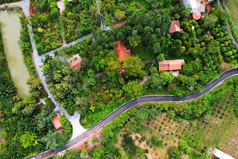 Vậy rồi, hơn 10 năm qua bà cứ thầm lặng, góp nhặt từng cái cây, từng giống loài để vùng rừng của bà ngày thêm đa dạng. Bà xây dựng thêm 1 nhà hàng, 1 phòng trà và 8 căn villa diện tích từ 30-140m2 được làm hoàn toàn bằng những vật liệu thân thiện với môi trường như: gạch nung tự nhiên, mái ngói, tre, gỗ… với kiến trúc nhà ba gian Bắc bộ, Trung bộ và cả nhà sàn Tây Nguyên. Tuy nhiên, diện tích trồng cây vẫn chiếm đến 95% trên tổng diện tích của khu nghỉ dưỡng.