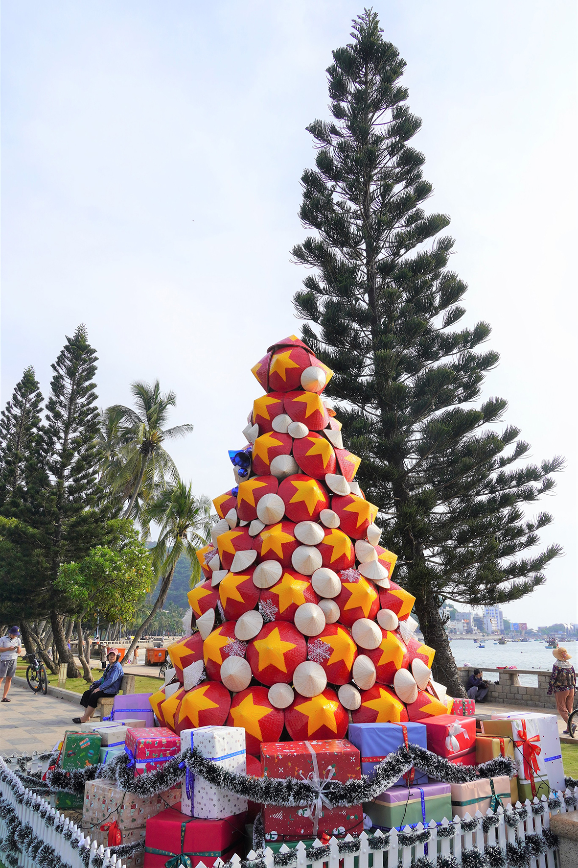| Cây thông Santa Run được tạo hình từ 200 chiếc nón lá lớn nhỏ ngộ nghĩnh tại Bãi Trước. |