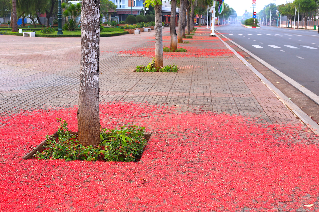 | Hoa lộc vừng nhỏ li ti bung nở, rơi xuống gốc dệt thành tấm thảm nhung đỏ-vàng bao phủ một khoảng rộng vỉa hè kéo dài nhiều cây số. |