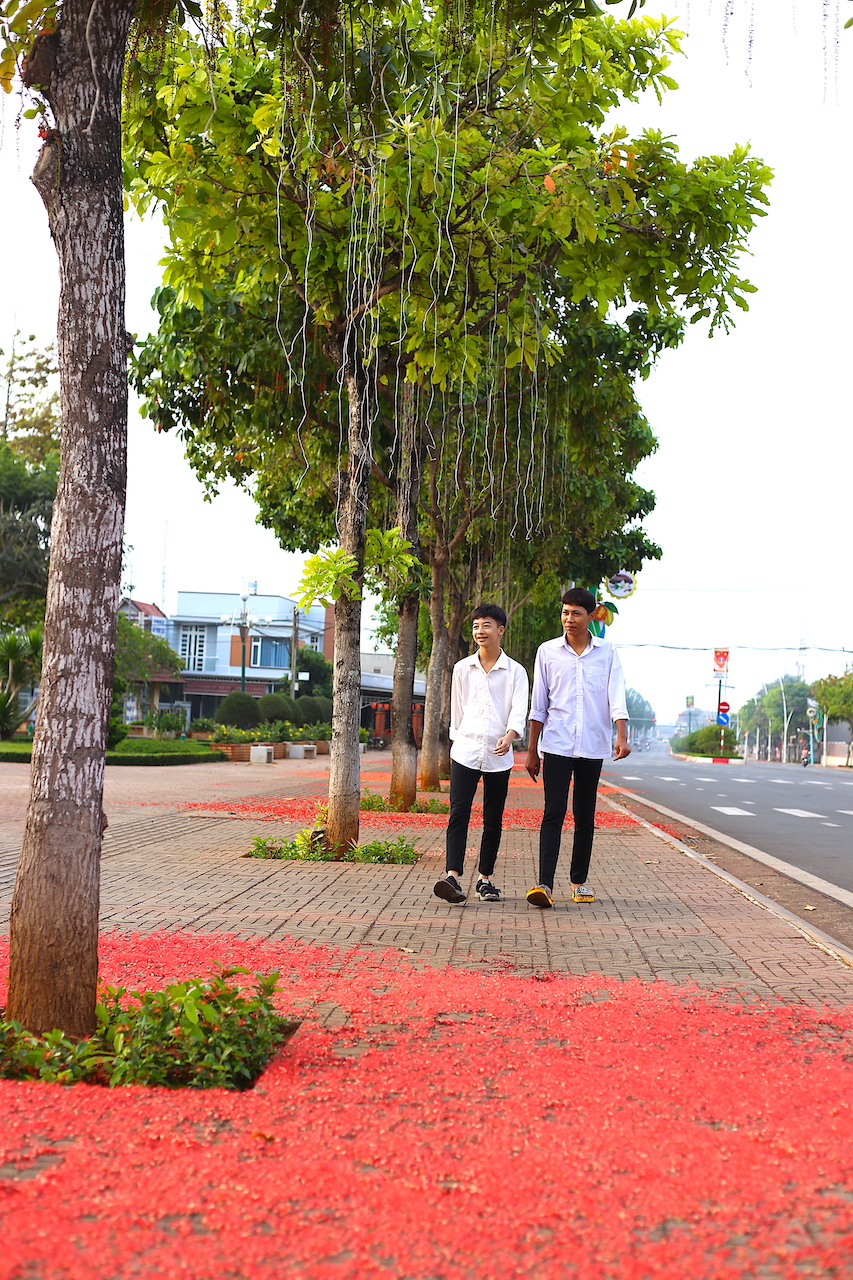 | Lộc vừng được trồng khắp các con đường trung tâm ở thị trấn Ngãi Giao và xã Kim Long để tạo cảnh quan đô thị. Trong ảnh: Hai nam sinh đi học về trên con đường trải thảm hoa đỏ ở thị trấn Ngãi Giao. |