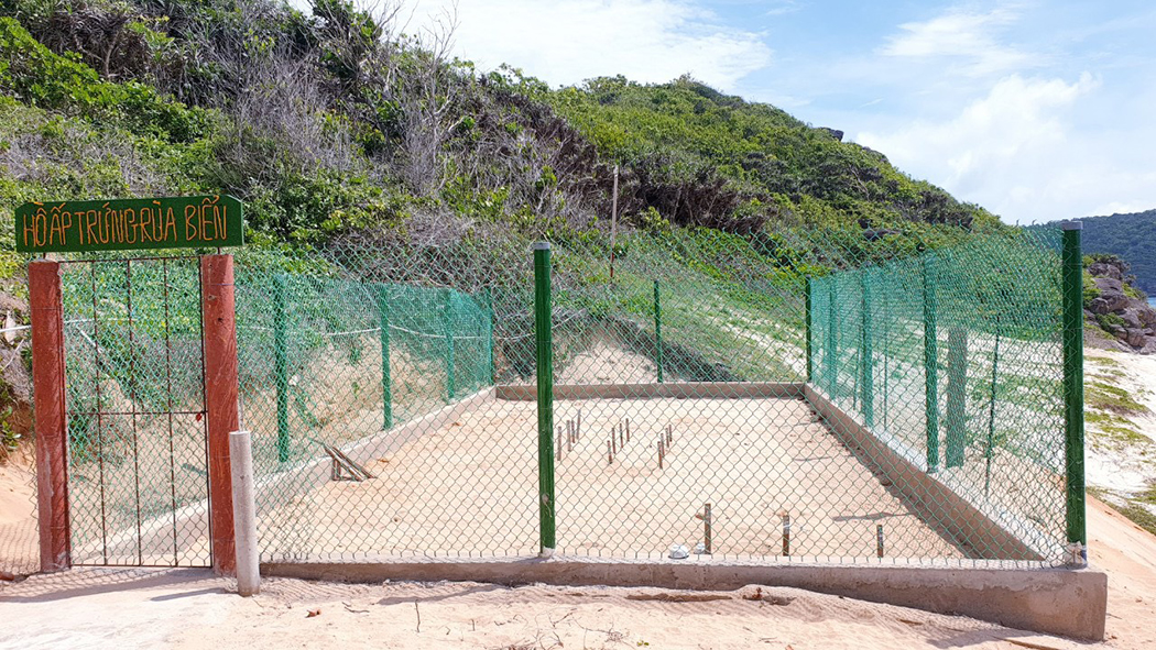 Công trình hồ ấp trứng rùa tại Hòn Tài có diện tích hơn 80m2, móng bê tông kiên cố, tường gạch, lưới B40 bao quanh liên kết với các cột trụ thép, mái lưới chống nắng, có cổng sắt, có camera giám sát… được thi công và hoàn thành trong Quý II/2023.