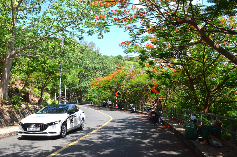 | Vào hạ, đường Hải Đăng lên Núi Nhỏ đẹp lãng mạn với hoa phượng đỏ và cây xanh rợp bóng mát. |