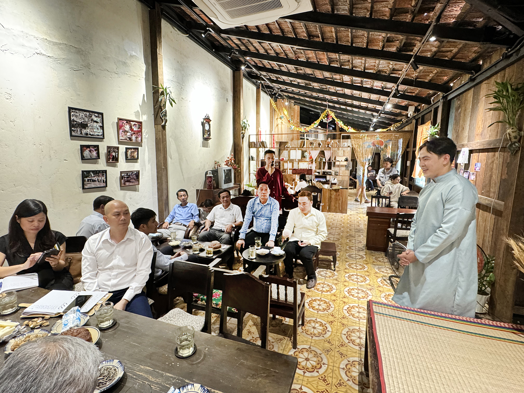 | Đoàn nghe chia sẻ về mô hình du lịch ẩm thực liên phường tại không gian Nam bộ xưa Ní cà phê (128D1 Nguyễn Đình Chính, Q.Phú Nhuận). |