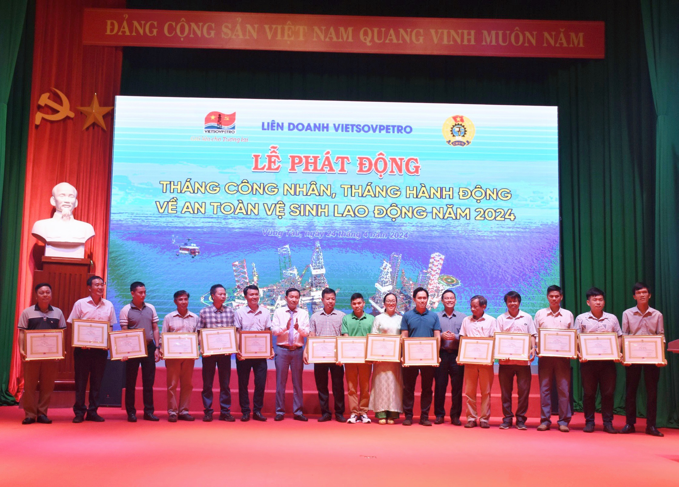 Tại lễ phát động, 6 tập thể và 17 cá nhân có thành tích xuất sắc trong công tác bảo hộ lao động năm 2023 được Công đoàn Liên doanh Việt - Nga Vietsovpetro biểu dương và trao Bằng khen.