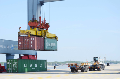 | Từ cuối tháng 4-2018, nhiều hãng tàu dự kiến tăng phí vận chuyển. Việc làm này khiến DN xuất khẩu gặp khó. Trong ảnh: Bốc container lên tàu tại cảng quốc tế Cái Mép (CMIT). Ảnh: THÀNH HUY |