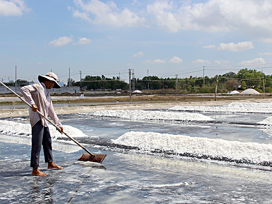 Theo Sở NN-PTNT, trên địa bàn tỉnh hiện có khoảng 827ha diện tích sản xuất muối, trong đó 35ha canh tác theo hình thức trải bạt. Năm nay, niên vụ muối trễ 1 tháng so với thông thường do mùa mưa kéo dài. Cộng thêm việc thời điểm này đã xuất hiện mưa đầu mùa nên niên vụ muối sẽ kết thúc sớm, dự kiến năng suất muối toàn tỉnh năm nay chỉ khoảng 50 ngàn tấn, đạt 65% kế hoạch năm.