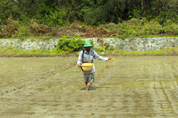| Cơ quan chức năng khuyến cáo để thuận lợi cho việc điều tiết nước tưới, bà con nông dân cần gieo sạ đúng thời vụ của Sở NN-PTNT. Trong ảnh: Nông dân gieo sạ vụ Hè Thu tại ấp An Lạc, xã An Nhứt, huyện Long Điền. |