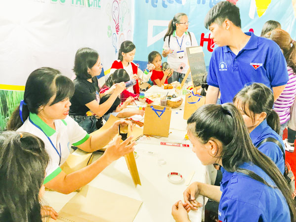 | Các bạn trẻ gấp giấy loại thành những chiếc giỏ xách xinh xắn. |