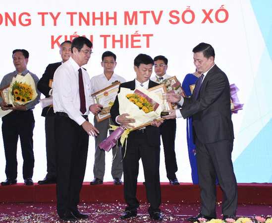 | Ông Nguyễn Thành Long, Ủy viên Ban Thường vụ Tỉnh ủy, Quyền Chủ tịch UBND tỉnh (bìa phải) và ông Trần Đình Khoa, Ủy viên Ban Thường vụ Tỉnh ủy, Bí thư Thành ủy Vũng Tàu trao Bằng khen và Cúp “Ngọn Hải Đăng” cho đại diện Công ty TNHH MTV Xổ số kiến thiết tỉnh BR-VT. |