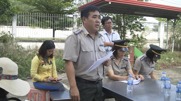 | Cán bộ Cục THADS tỉnh đọc quyết định kê biên tài sản trong vụ án Công ty CP thép Quatron (Phú Mỹ). |