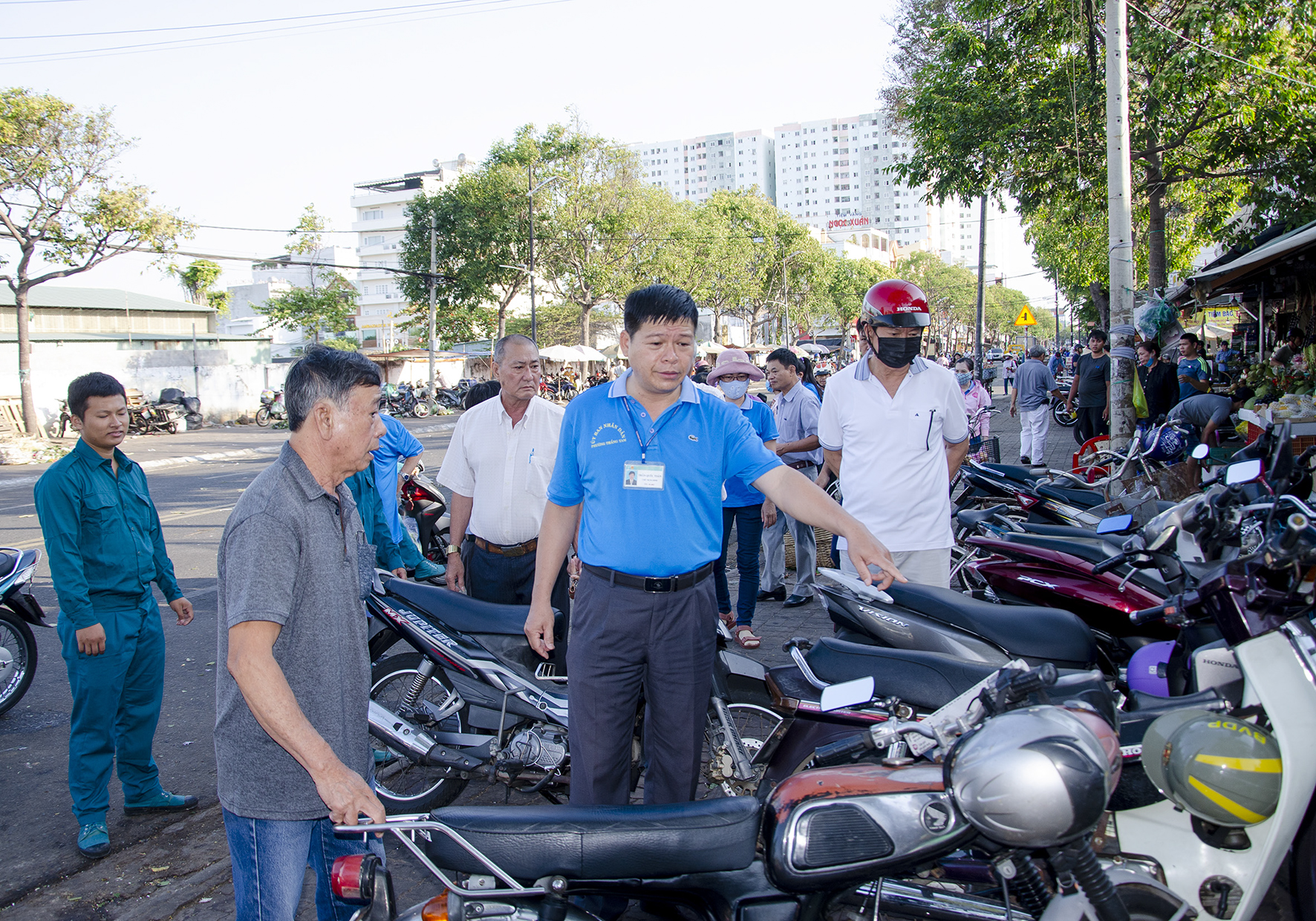 | Lực lượng chức năng phường Thắng Tam nhắc nhở người dân không lấn chiếm lòng đường, vỉa hè đường Nam Kỳ Khởi Nghĩa vào ngày 29/2. |