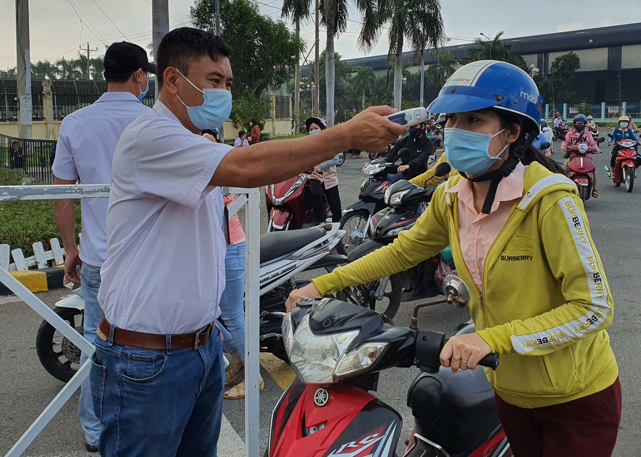 | CNLĐ Công ty TNHH Sản xuất giày Uy Việt (KCN Đông Xuyên, TP.Vũng Tàu) kiểm tra thân nhiệt trước khi vào làm việc sáng 10/12. |
