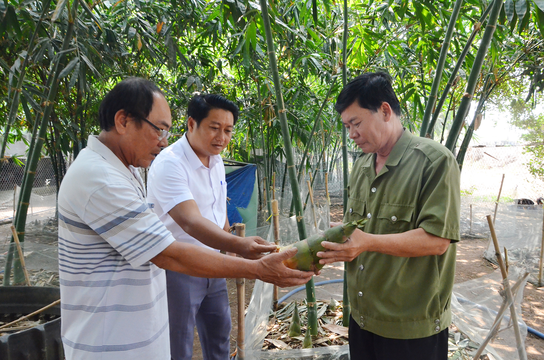 | CCB Nguyễn Tấn Tài (phải) giới thiệu mô hình trồng tre lấy măng. |
