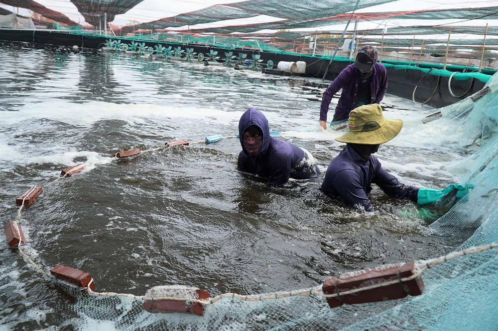 | Trước đại dịch COVID-19 diễn biến phức tạp, thị trường tiêu thụ nông sản Việt Nam đứng trước khó khăn, thách thức. Trong ảnh: Thu hoạch tôm công nghệ cao tại xã An Ngãi, huyện Long Điền . |