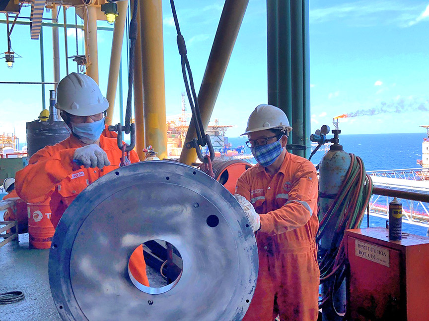 | Người lao động Vietsovpetro làm việc trên Giàn nén khí trung tâm. |