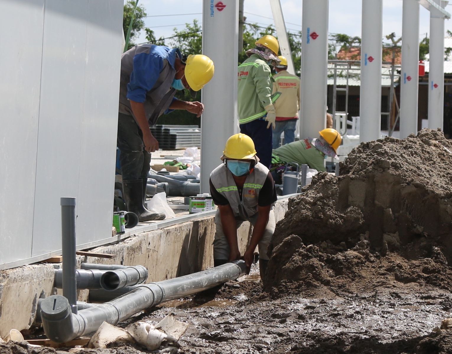 | Lắp đặt hệ thống đường ống dẫn nước sạch tại bệnh viện dã chiến trên đường Nguyễn Văn Linh (TP Hồ Chí Minh). Ảnh: Trần Xuân Tình/TTXVN. |