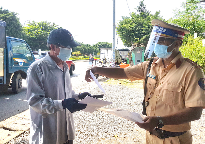| Lực lượng CSGT kiểm tra giấy thông hành và giấy xét nghiệm âm tính với COVID-19 một tài xế xe tải vận chuyển hàng hóa vào địa bàn TP. Vũng Tàu tại chốt kiểm dịch cầu Cỏ May. (Ảnh chụp trưa ngày 19/8) |