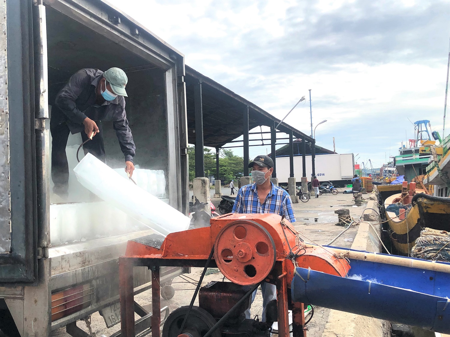 Ngư dân Lộc An vận chuyển nguyên liệu lên tàu cá để chuẩn bị xuất bến ra khơi.