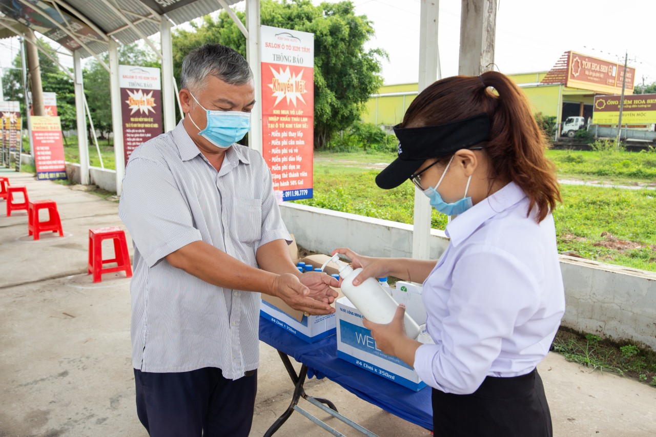 | Nhân viên Salon Ô tô Kim Tâm sát khuẩn tay cho khách hàng đến bảo dưỡng xe. |
