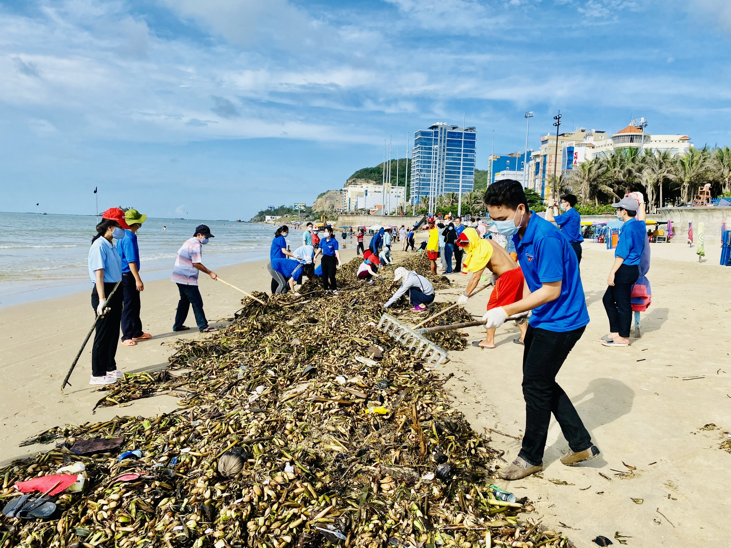 | Lực lượng ĐVTN tham gia thu gom rác thải đại dương, trong đó có phần lớn là rác thải nhựa trôi dạt vào bờ biển Vũng Tàu. |