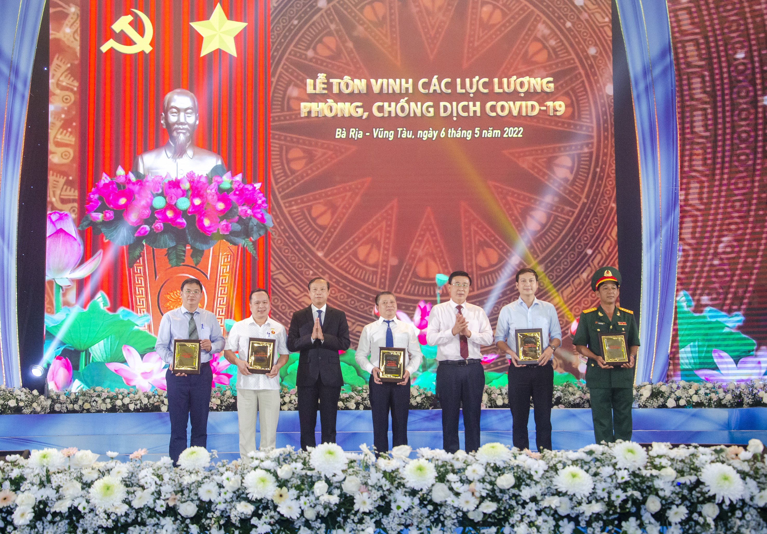 | Ông Nguyễn Văn Thọ, Chủ tịch UBND tỉnh và ông Huỳnh Văn Danh, Trưởng Ban Dân vận Tỉnh ủy trao Thư Cảm ơn của UBND tỉnh đến đại diện các đoàn chi viện cho BR-VT trong thời gian cả tỉnh chung tay chống dịch. |