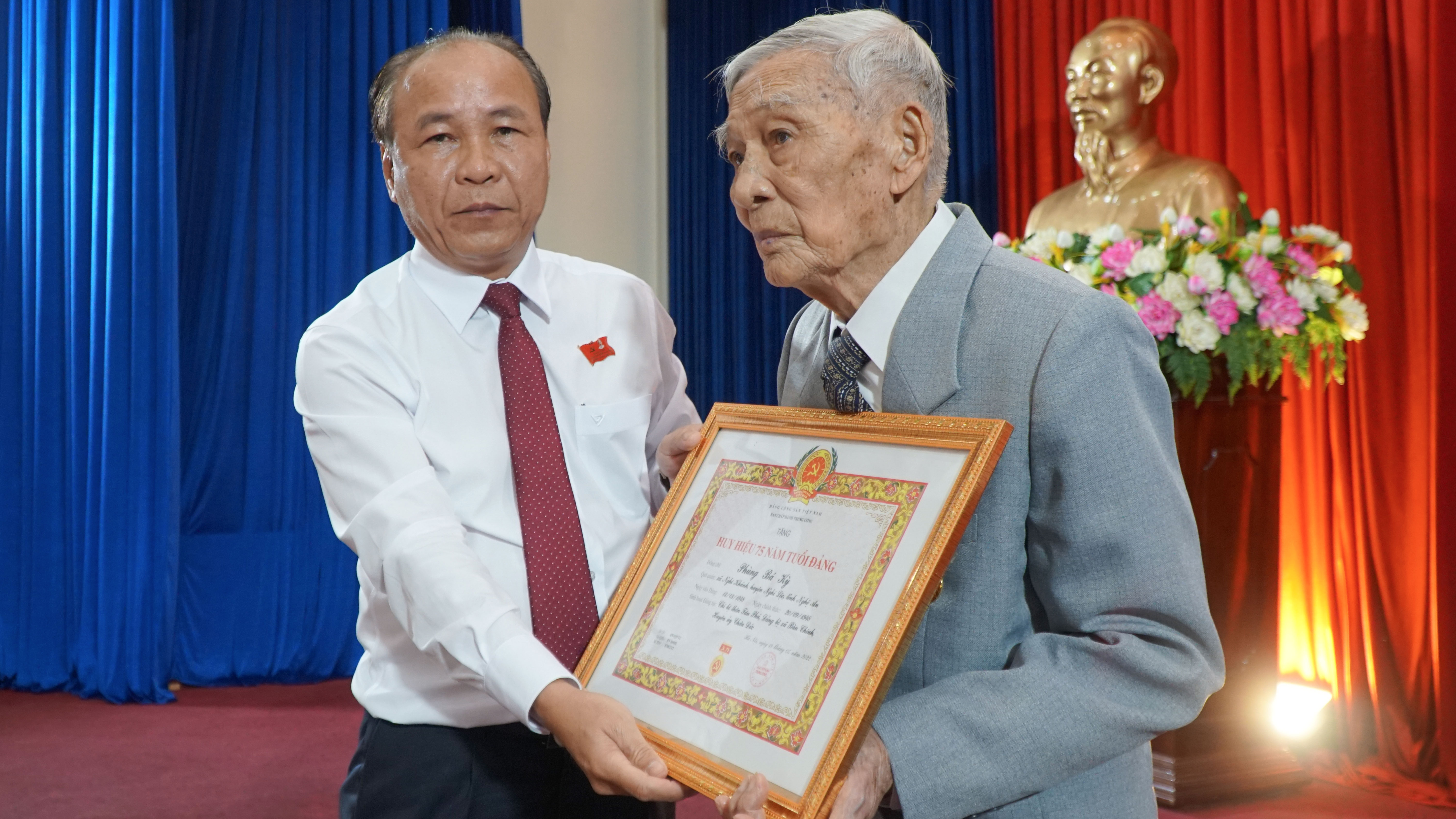 | Ông Nguyễn Văn Việt, Bí thư Huyện ủy Châu Đức trao Huy hiệu 75 năm tuổi Đảng cho ông Phùng Bá Kỳ, đảng viên sinh hoạt tại Chi bộ thôn Tân Phú, Đảng ủy xã Bàu Chinh. |